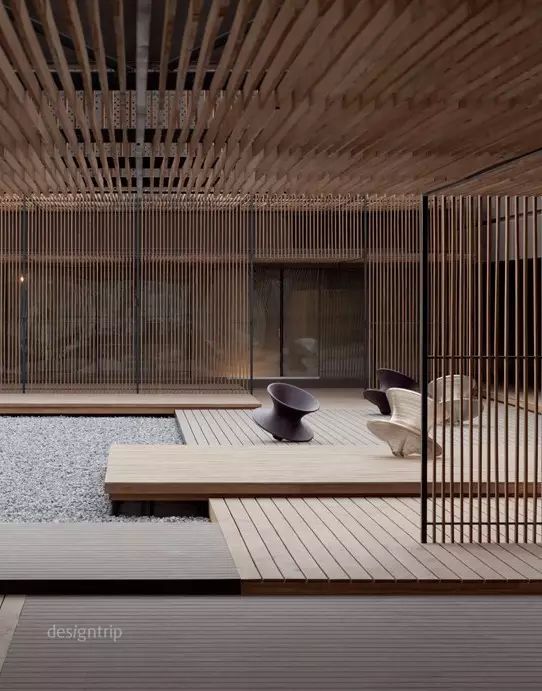 格柵的柵(shan)意爲用竹木鐵條等做成的阻攔物,格柵在空間與空間的隔斷中可以做到朦朧優雅不沉悶,創造光與影的朦朧之美,光線透過格柵呈現出一種如同皮影戲,不一般的藝術張力,格柵外走動的人亦成爲戲中一角,因此被大量的運用到中式空間設計中去